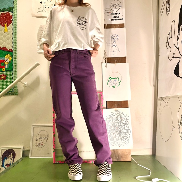 <コメント> くすんだパープルが雰囲気◎なLevis501の後染めデニムです♡ 後染めデニムの中でもあまり見かけないカラーな印象のパープル☆ 所々色ムラや日焼け跡がありますが、個人的にはそれが逆に良いアジ出してるかなと思います♪♪ コーディネートが楽しくなる一本☆ <素材> コットン <平置き実寸サイズ> ウエスト幅 35cm(28インチ) ヒップ幅 50cm 股上 26cm 股下 78cm(31インチ) 総丈 102.5cm 着用スタッフ身長 159cm <表記サイズ> - <生産国> USA <年代> 90〜00s <コンディション> 所々に色ムラあり。 両サイド脇に日焼け跡あり。 古着の性質上、特有の風合いや若干の汚れ、糸のほつれ、キズ、リペア跡などのある商品もございます。古着という事をご理解して頂いた上でのご購入を前提とさせて頂いておりますので、基本的には返品、交換はお受け致しかねます。誠に申し訳ございませんが、ご理解頂きます様宜しくお願い致します。 万が一商品に記載の無い大きな不備等があった場合、ご注文とは異なる商品が届いた場合は、大変お手数ですが、直接店舗の方までご連絡下さい。(093-521-1980) ご相談の上、返品、交換等の手続きをさせて頂きます。その際の送料や手数料は当店でご負担させて頂きます。 店頭でも販売しておりますので、ご注文からご確認までタイムラグが生じ、その間売り切れる場合もございます。その際はこちらでご注文のキャンセル、もしくは直接お客様にご連絡させて頂きお振込みにてご返金させて頂きますので、予めご了承頂きます様宜しくお願い致します。