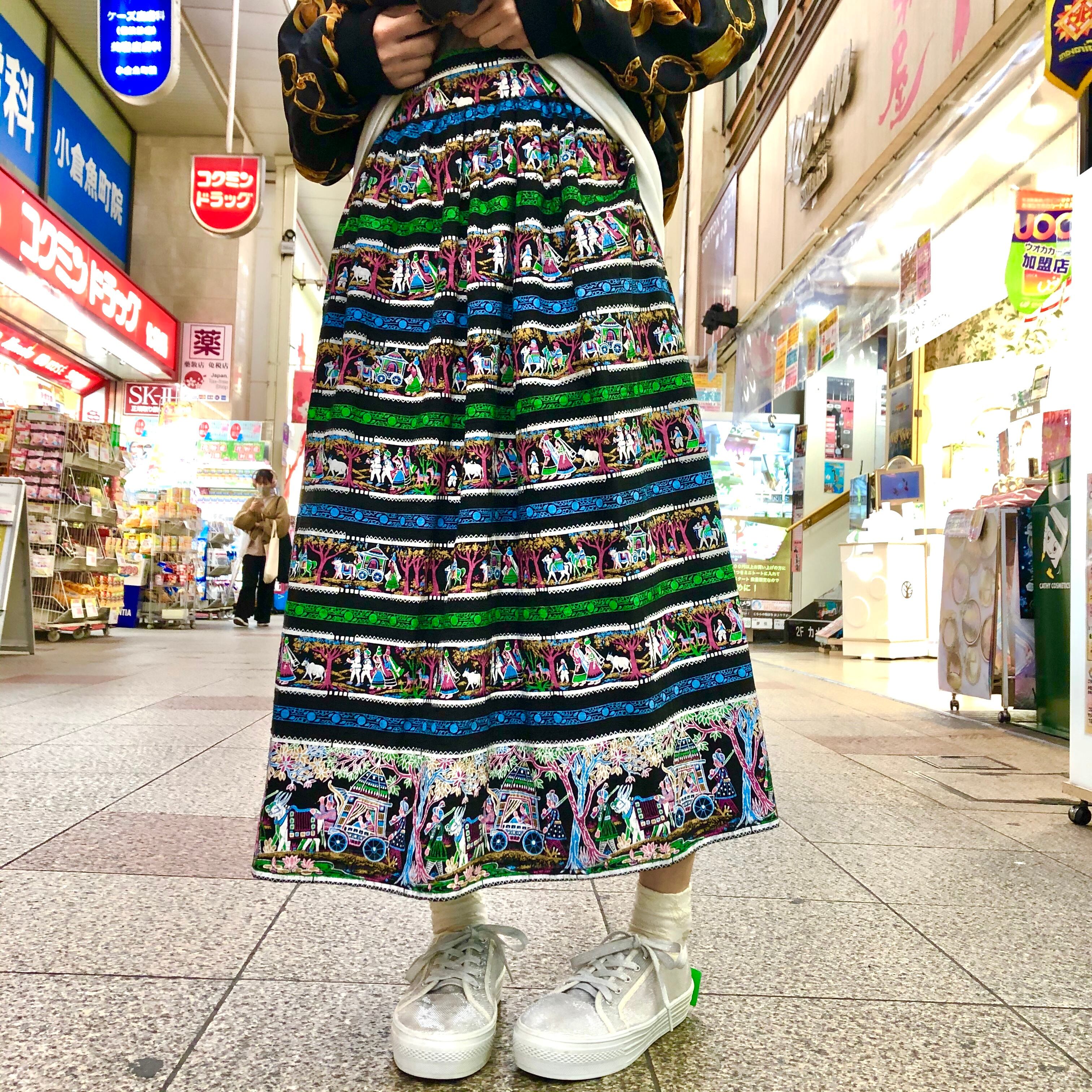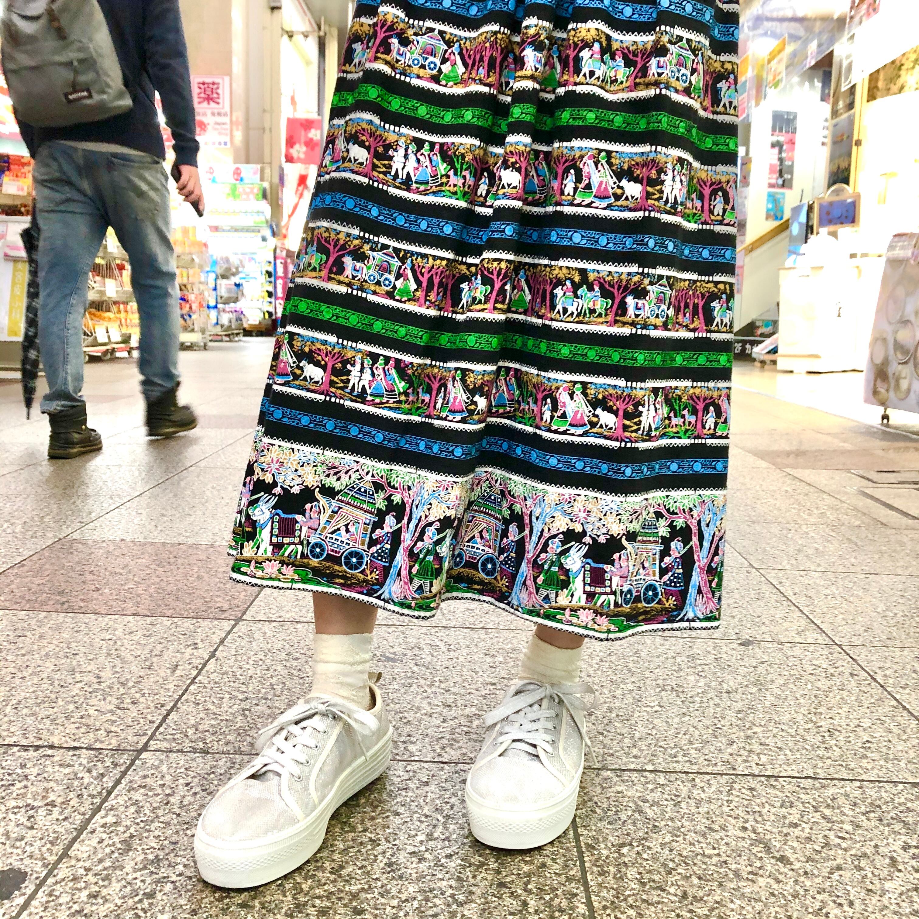 ボーダー状にオリエンタルな柄がハンドプリントされた雰囲気◎なAラインスカート♡