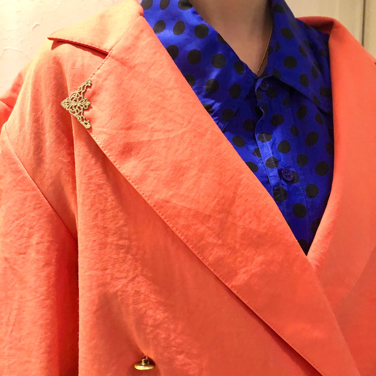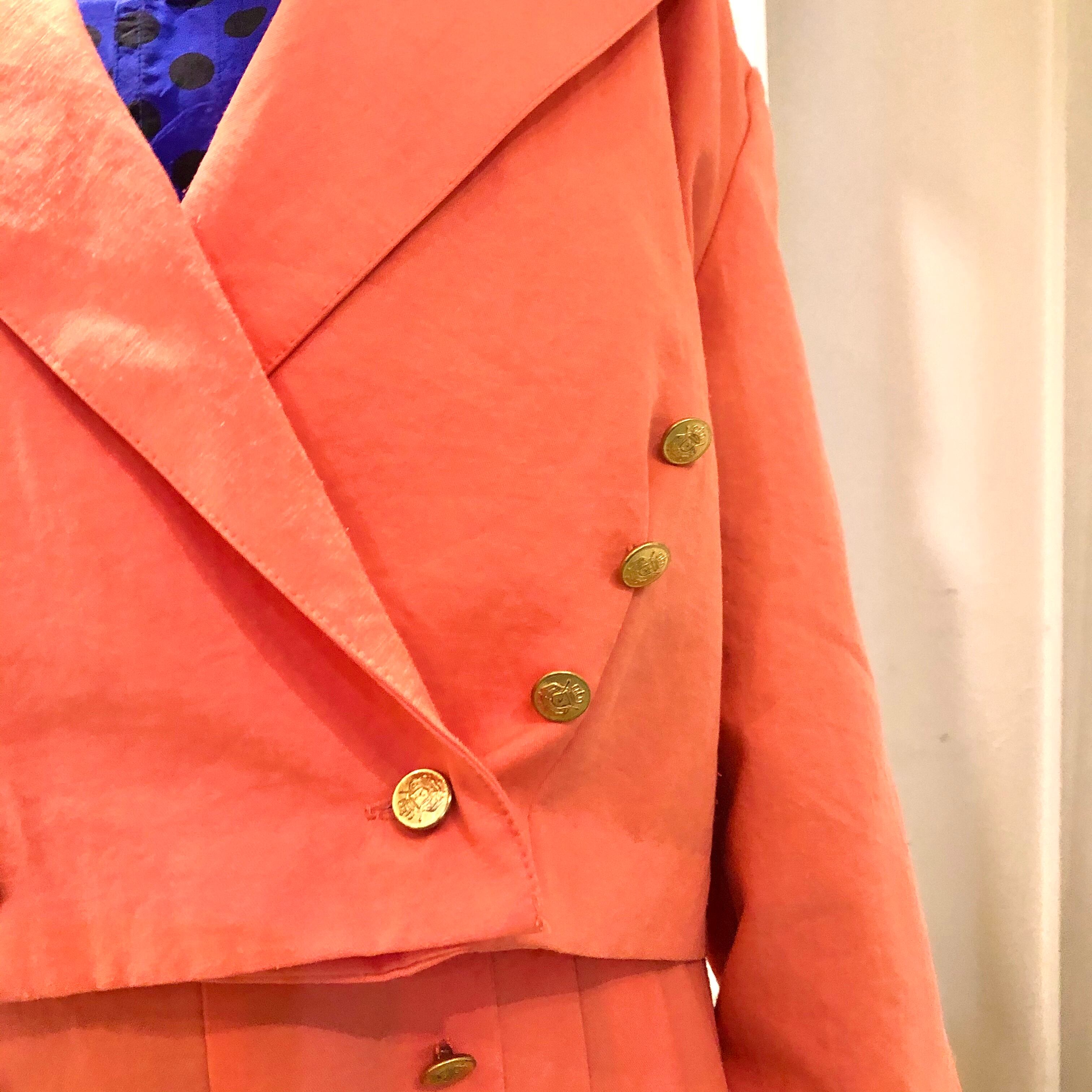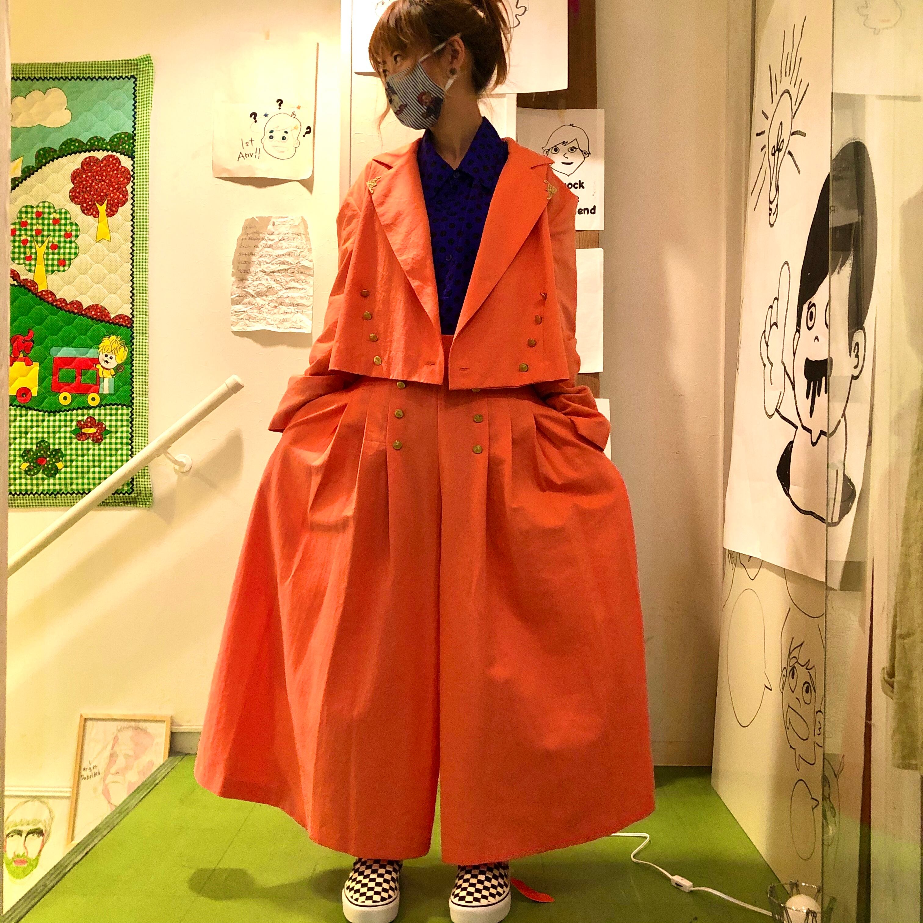 ダブルでショート丈のトップスに、袴の様なボリュームのあるボトムス、共にナイスデザインで個性的なポリエステルのセットアップ♡