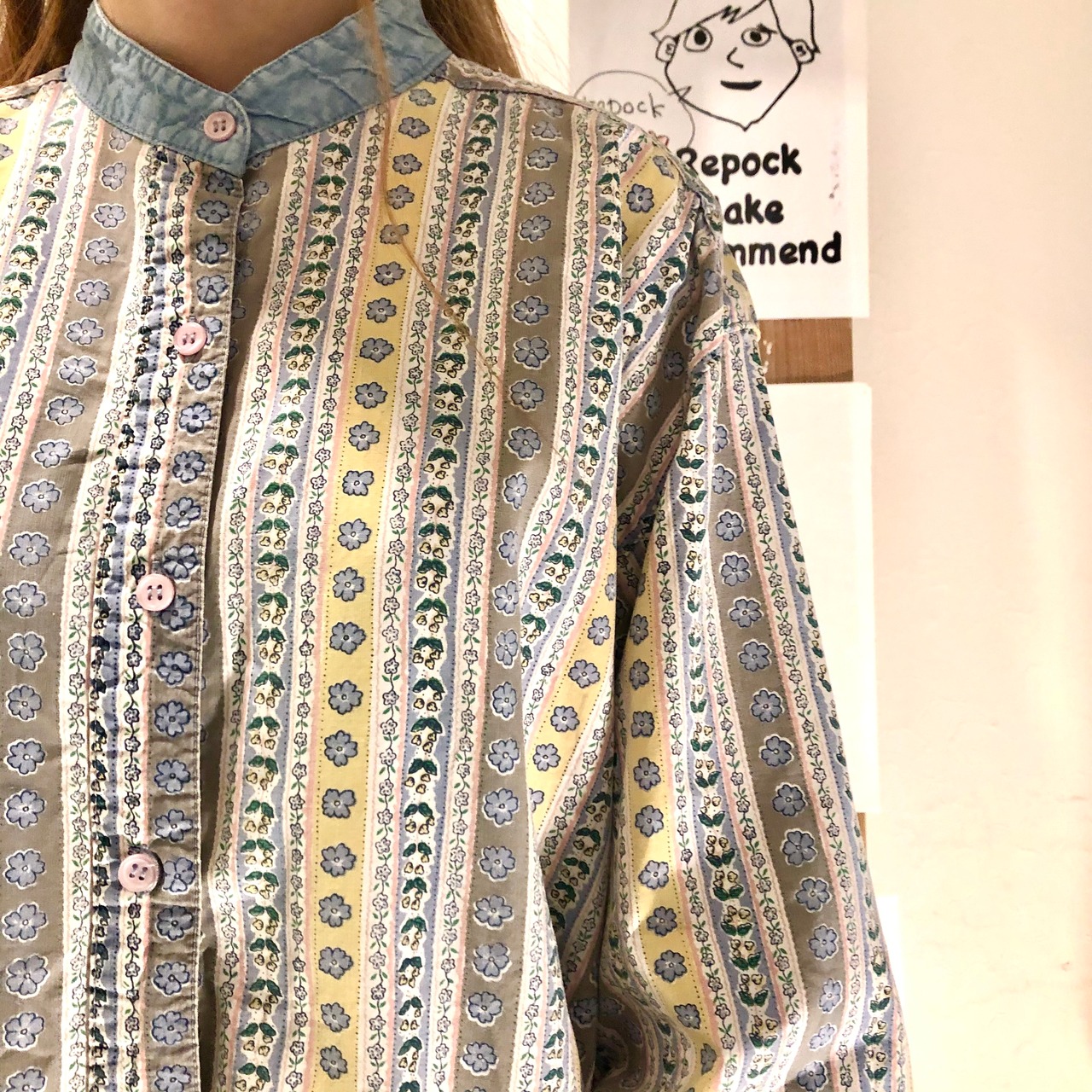 淡いカラーリングが◎な、デニムのスタンドカラーに花柄ストライプが可愛いコットンシャツ♡