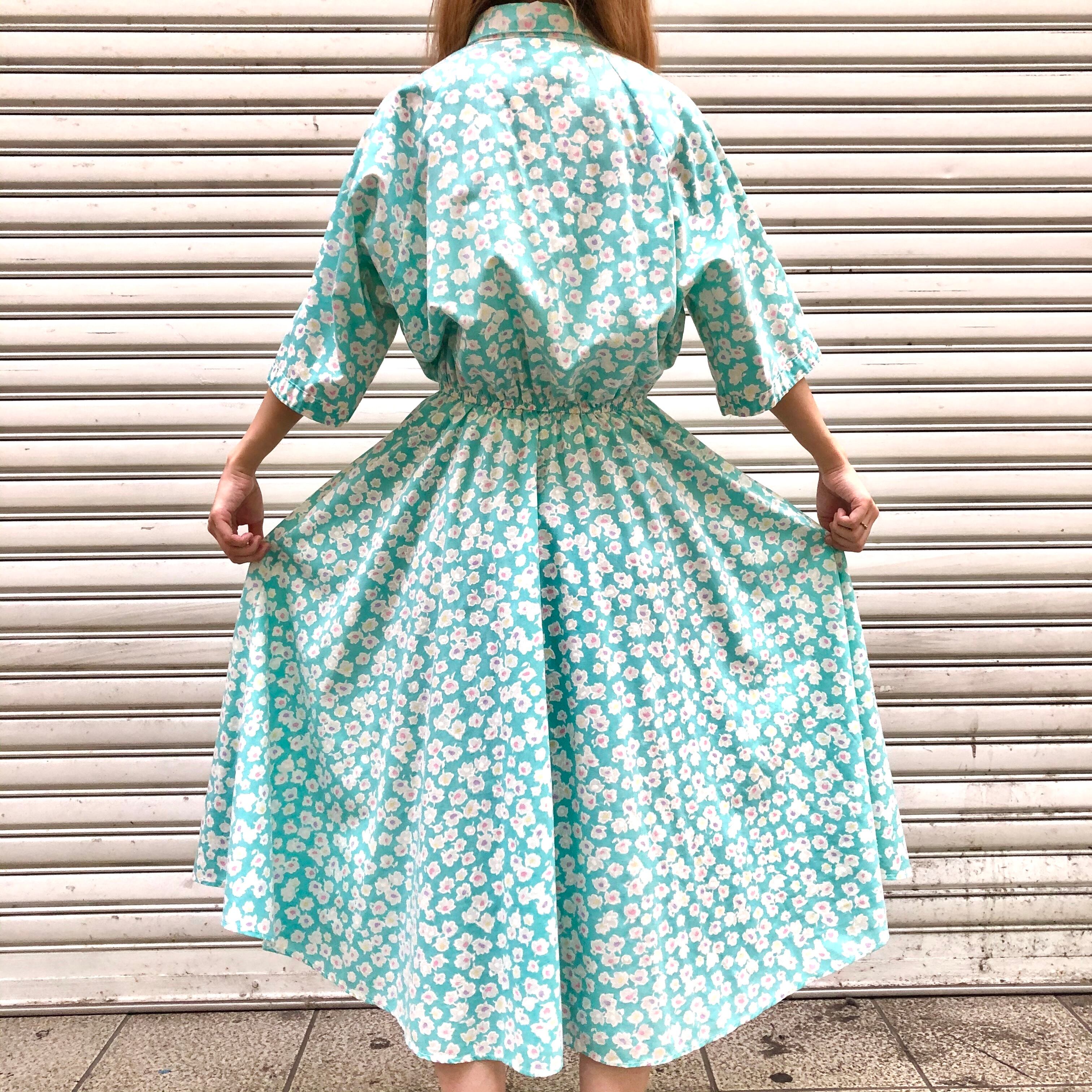 ポップな花柄、ラグランスリーブの5分袖、ウエストゴム入り、柄・型共に絶妙に良い塩梅なワンピース♡