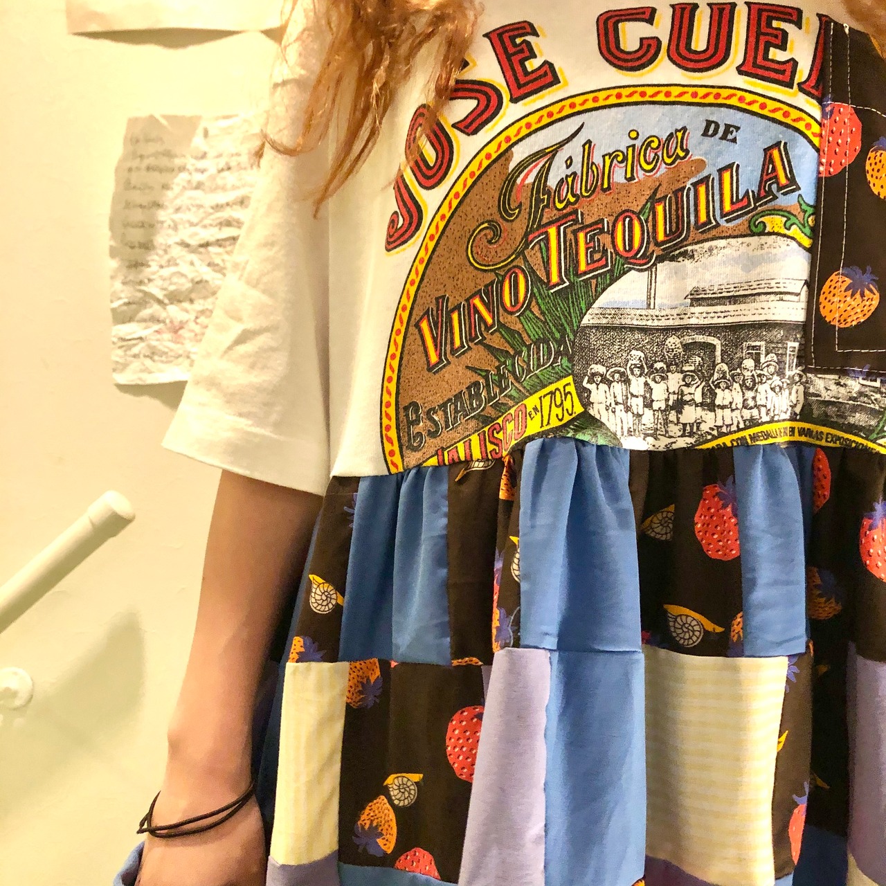 90s- Teeベースに4種類の生地でパッチワーク+裾にデニムでドッキングしたリメイクワンピース♡