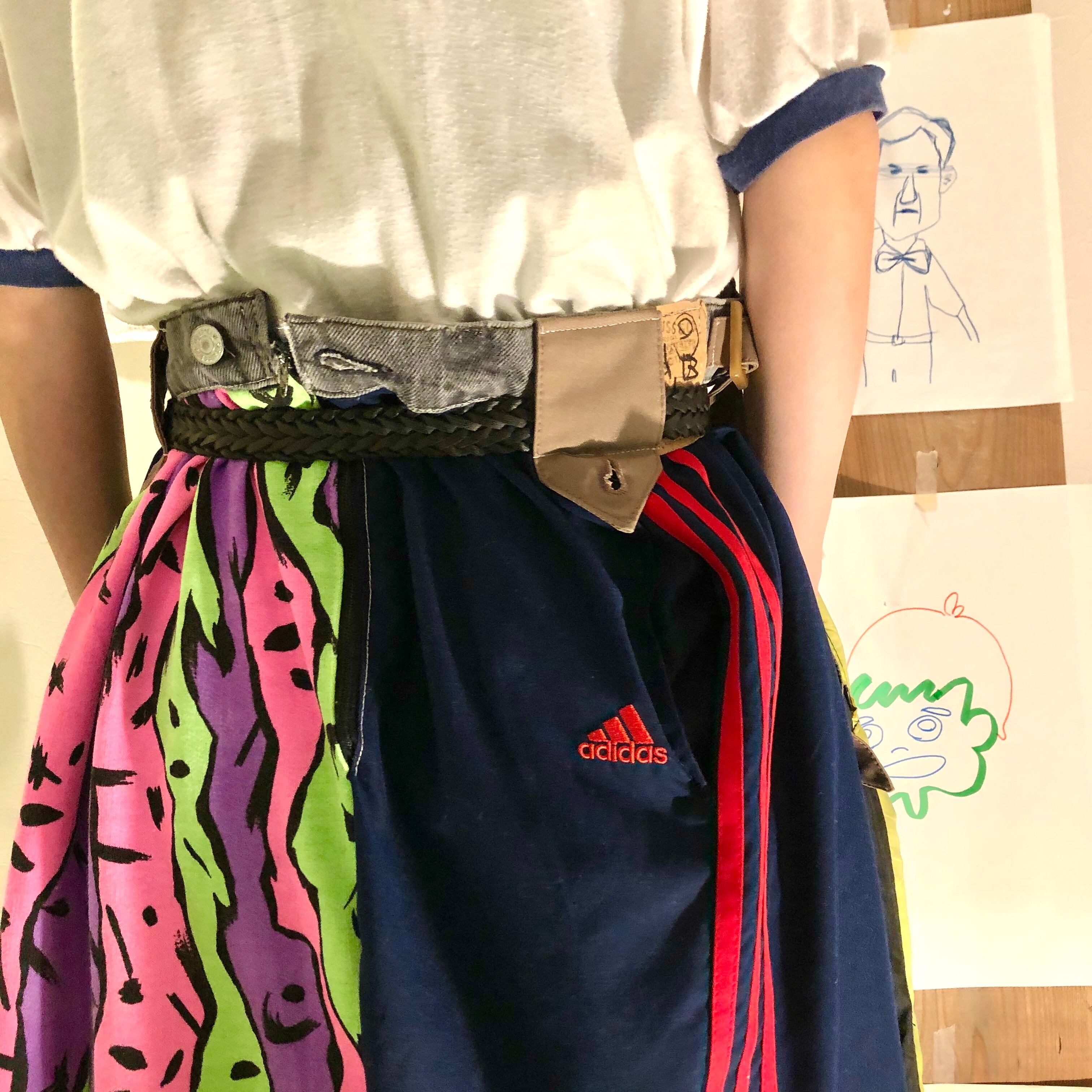 リバーシブルのナイロンパンツ、adidasのナイロンパンツを解体してドッキング、Levisのベルト部分、コートのエポレットをベルトループにドッキングしたリメイク スカート♡
