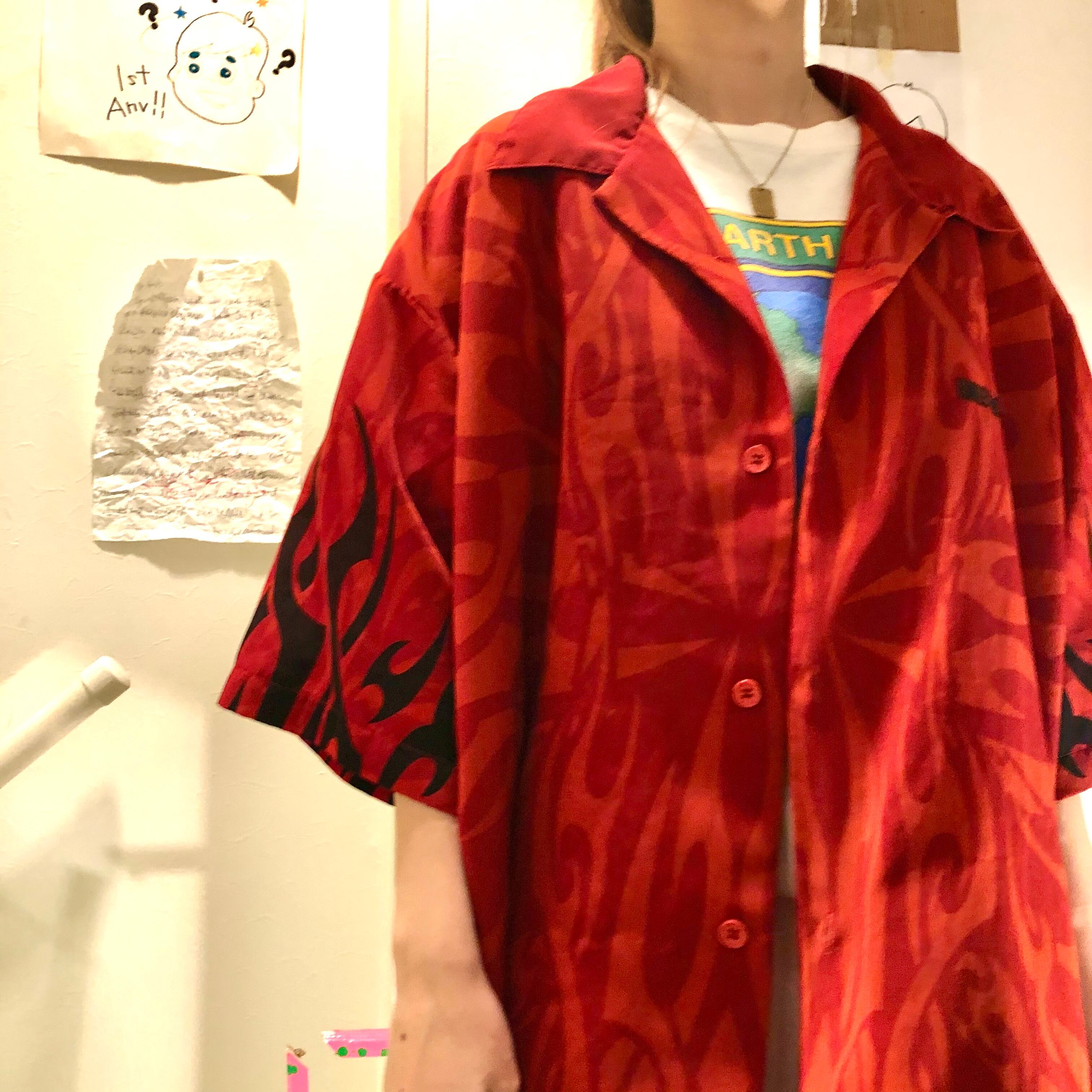 薄らトライバル柄のボディにファイヤーパターンな袖、フロント胸ワンポイント刺繍、バックプリント。