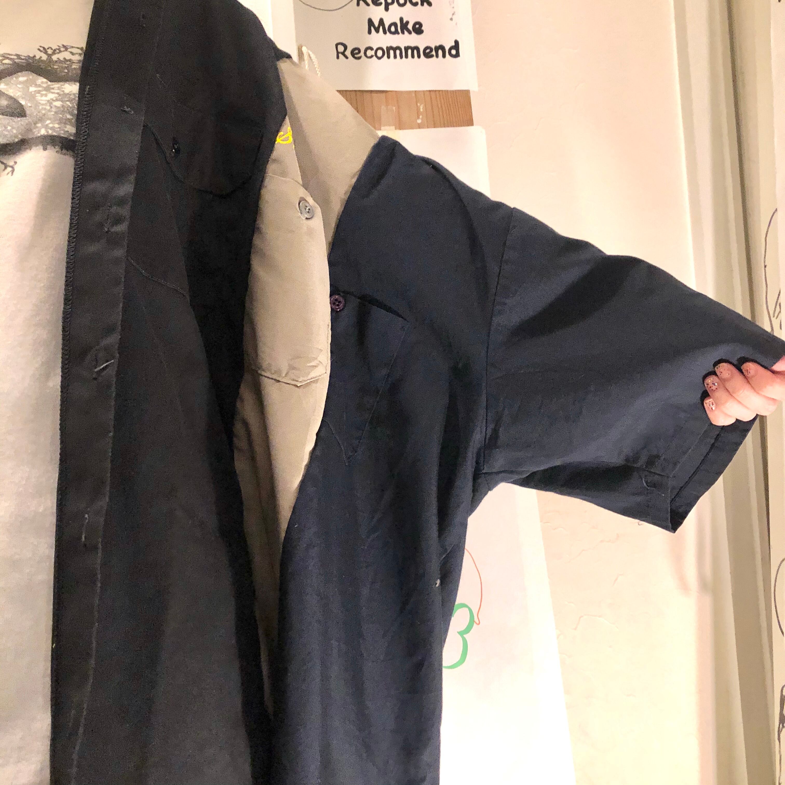 ワークシャツ3枚をドッキング、パックにTシャツの切り抜きとレターパッチを貼り付けた、どこかの誰かがカスタムした様なリメイクドッキングシャツ♡