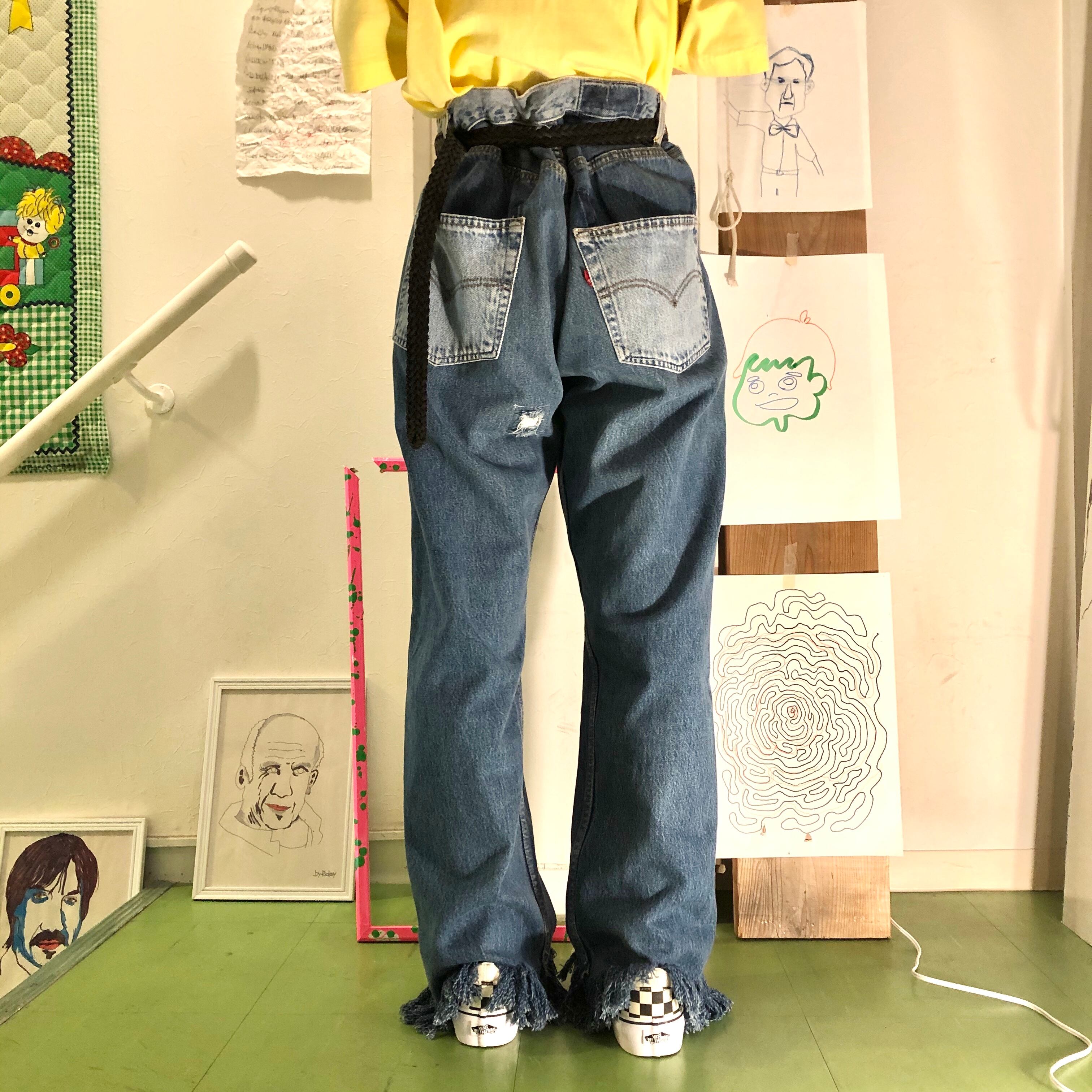 BigSizeのLevis501をベースに、ウエストサイズダウン、ベルト&バックポケットを付け替えて、裾をフリンジにした一本♡