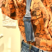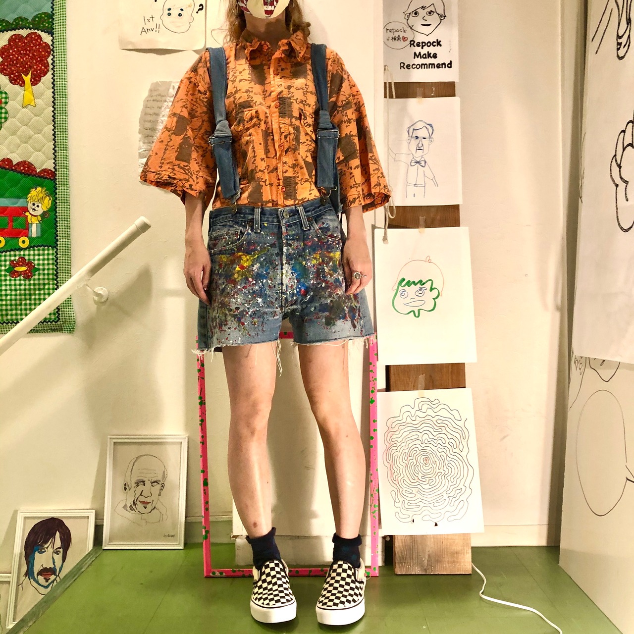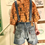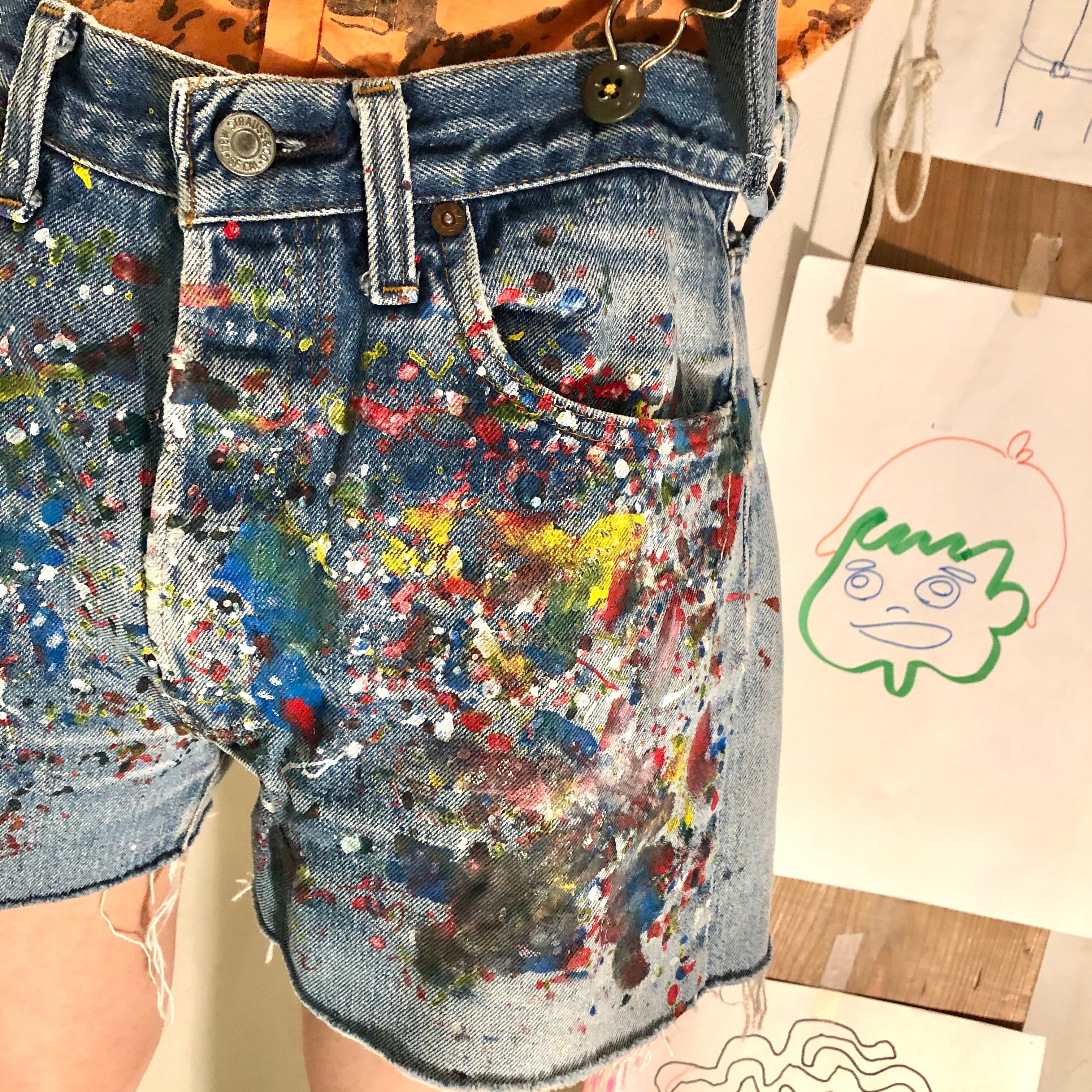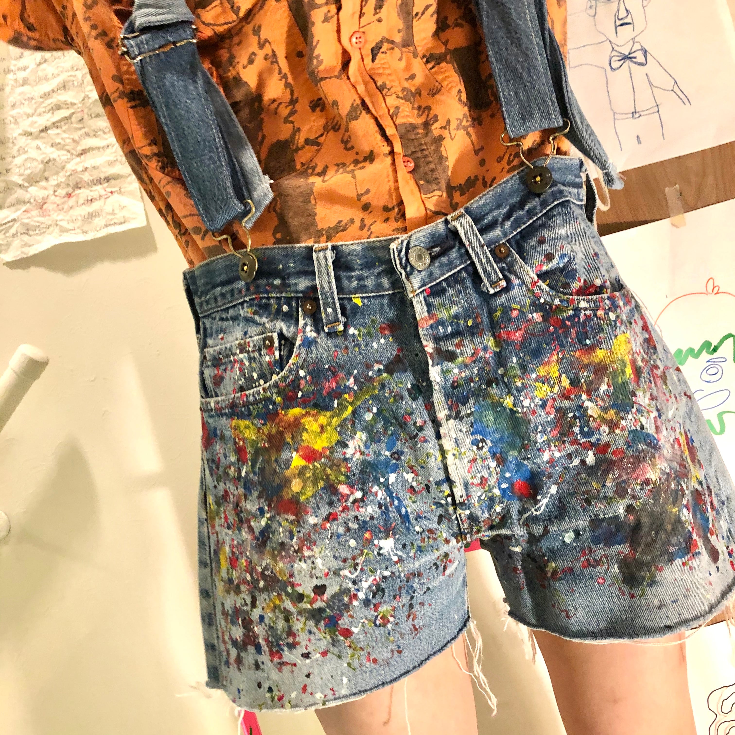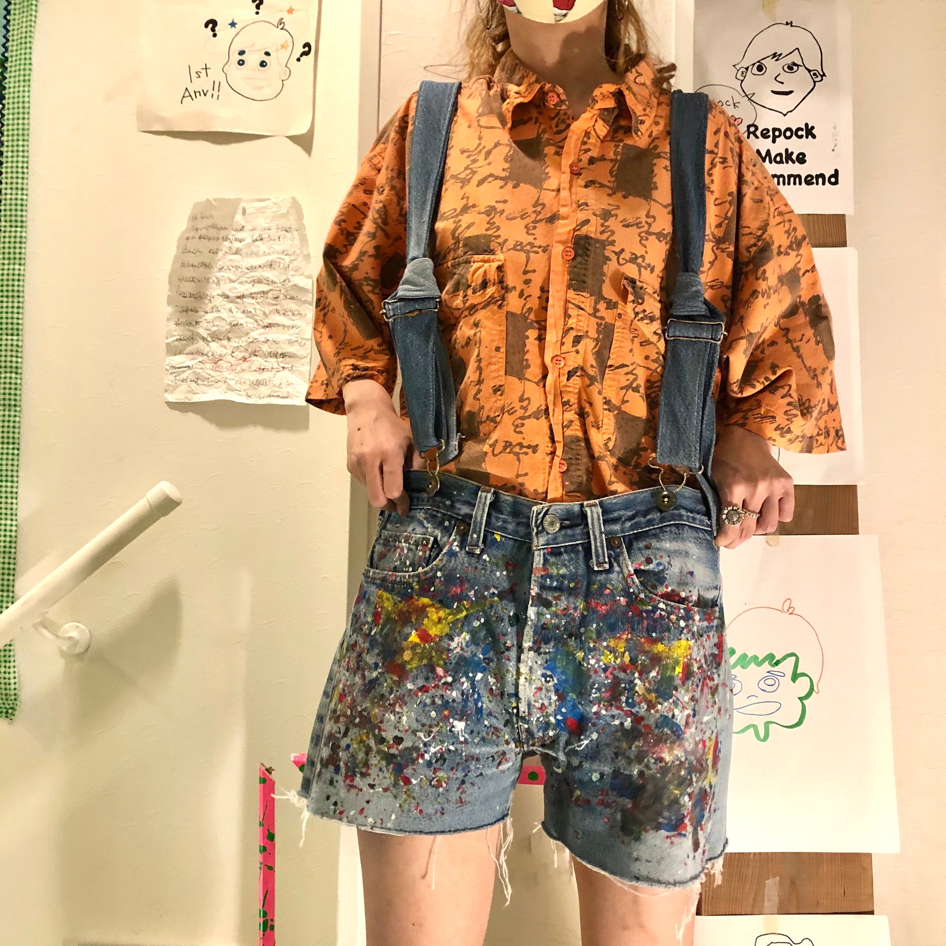 80s- Levis501をカットしてカラフルペイント、デニムの肩紐をプラスした、リメイクショートパンツ♡