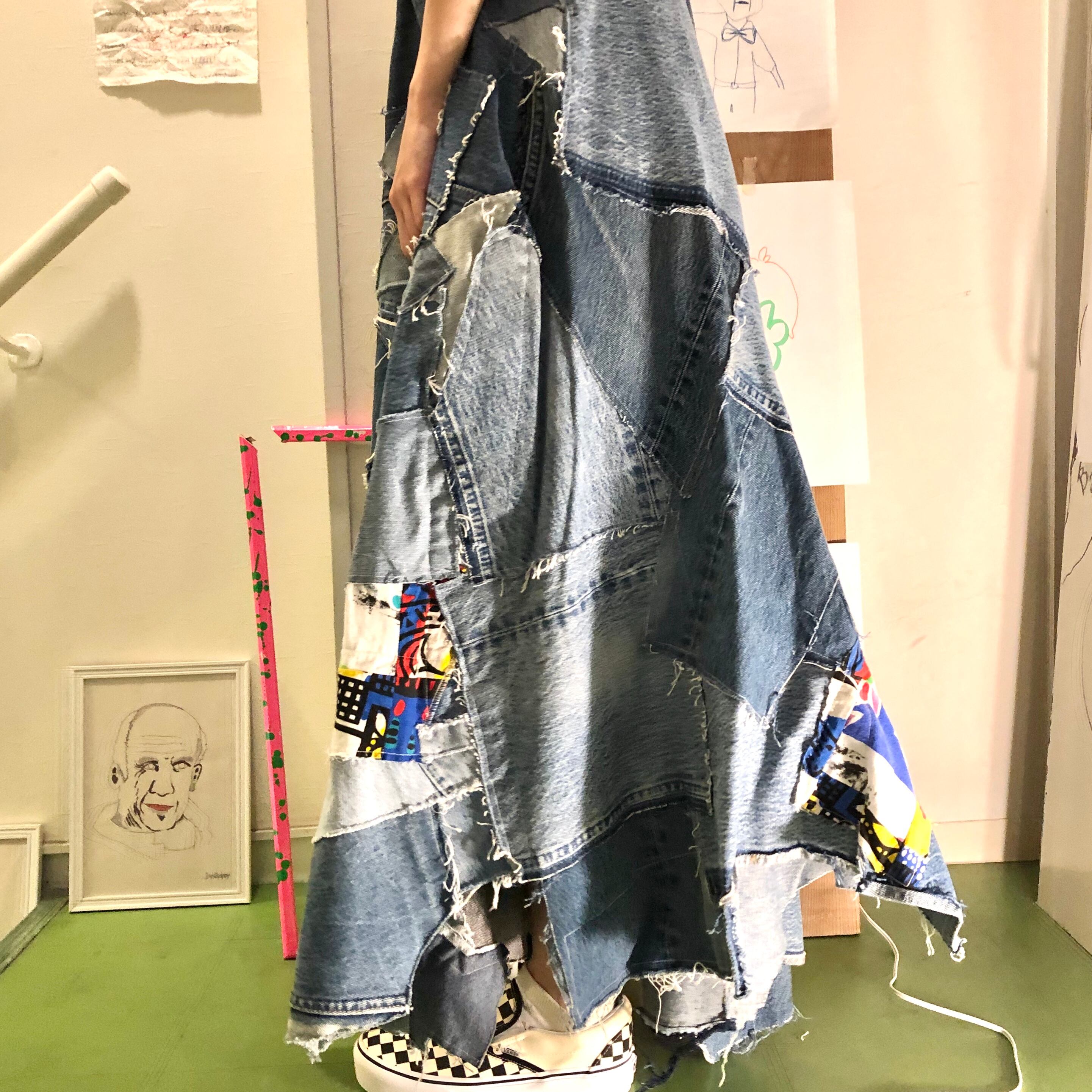 Levis501ベースに色々な濃淡なデニム、カラフルな総柄をパッチワークした生地を使ってツギハギし組み立てた、リメイクワンピース♡