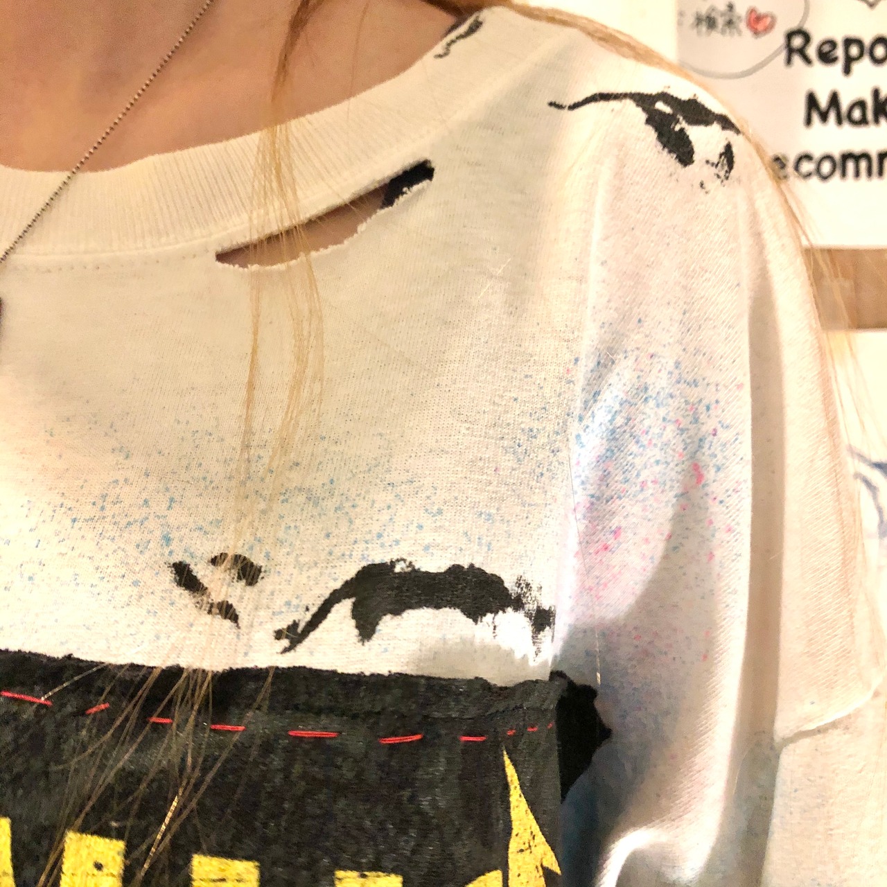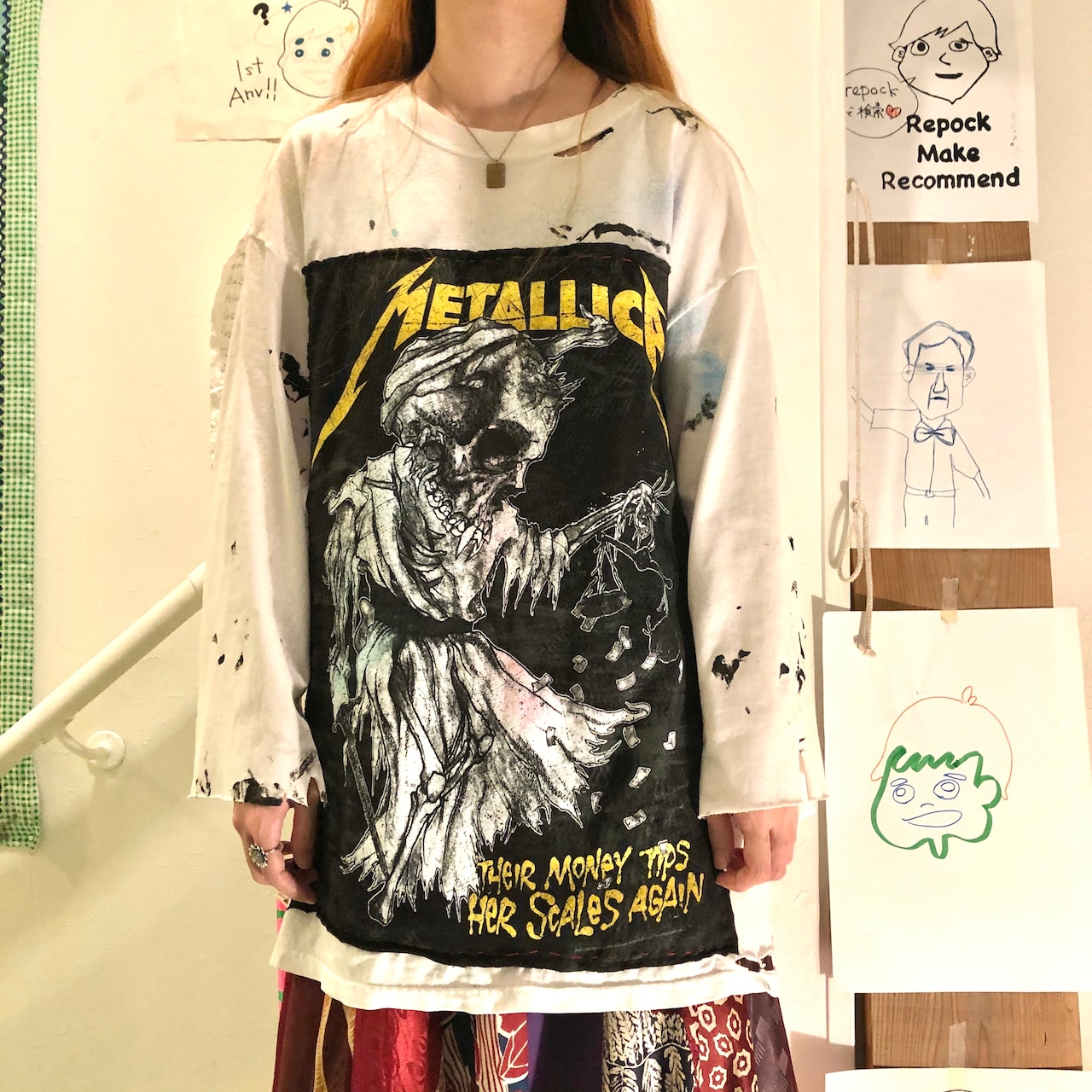 anvilの無地L/S Teeをベースに、フロントにMETALLICA・バックにGuns N' RosesのTシャツを切り抜いて貼り付け、ペイント&ダメージを施した、リメイクL/S Tシャツ♡