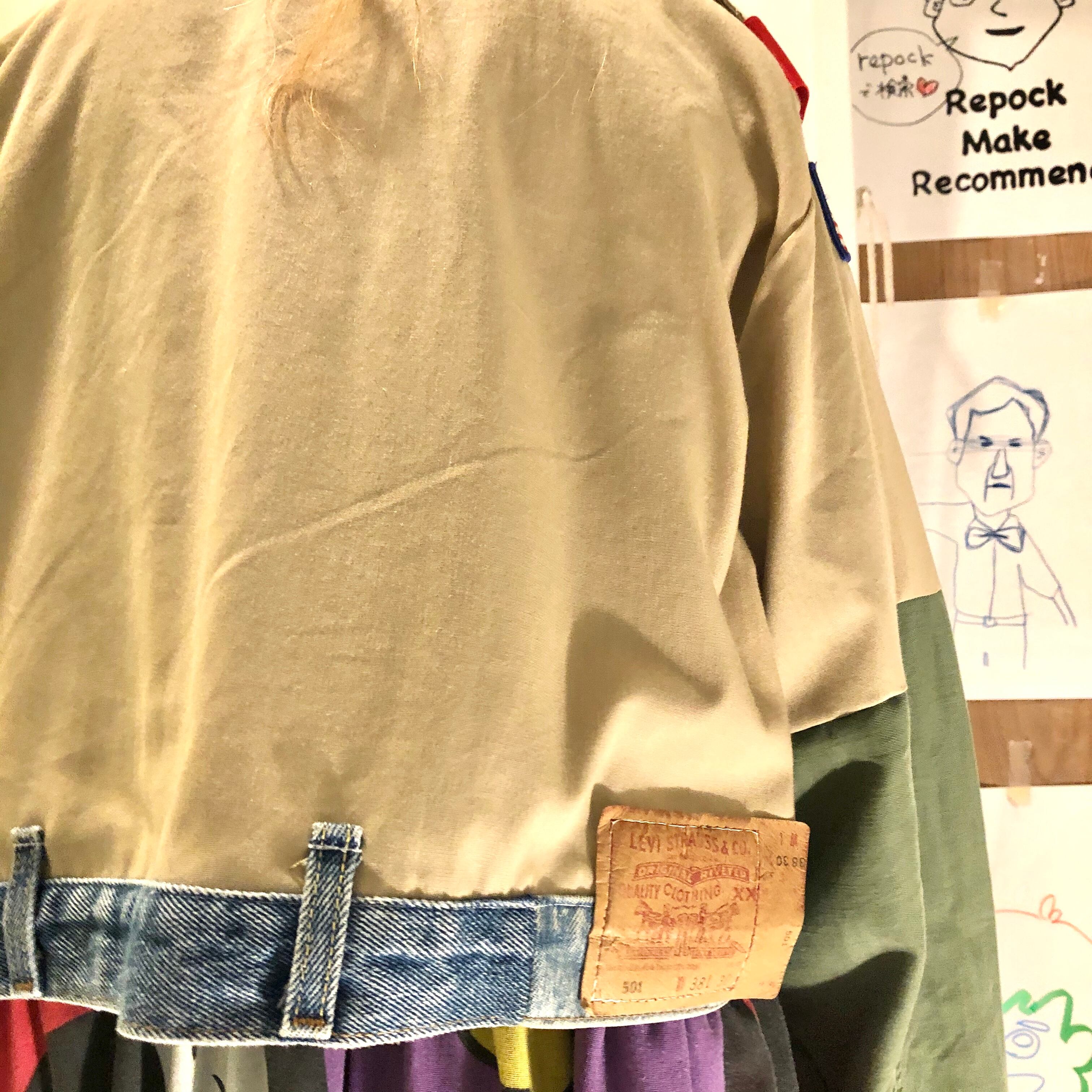 Oldなボーイスカウトシャツをベースにミリタリーシャツの袖、ショート丈にしてLevisのデニムパンツのベルトをドッキング♡