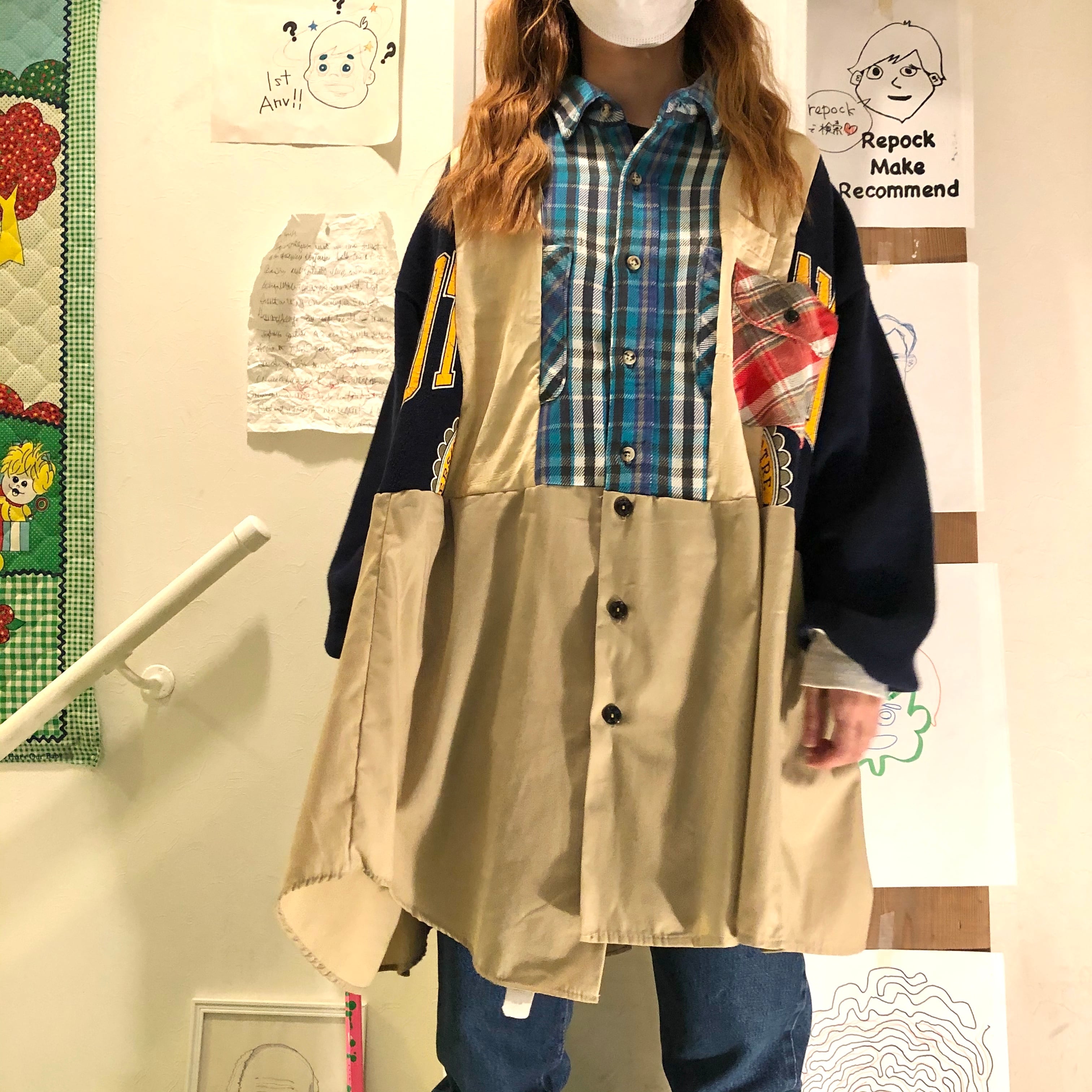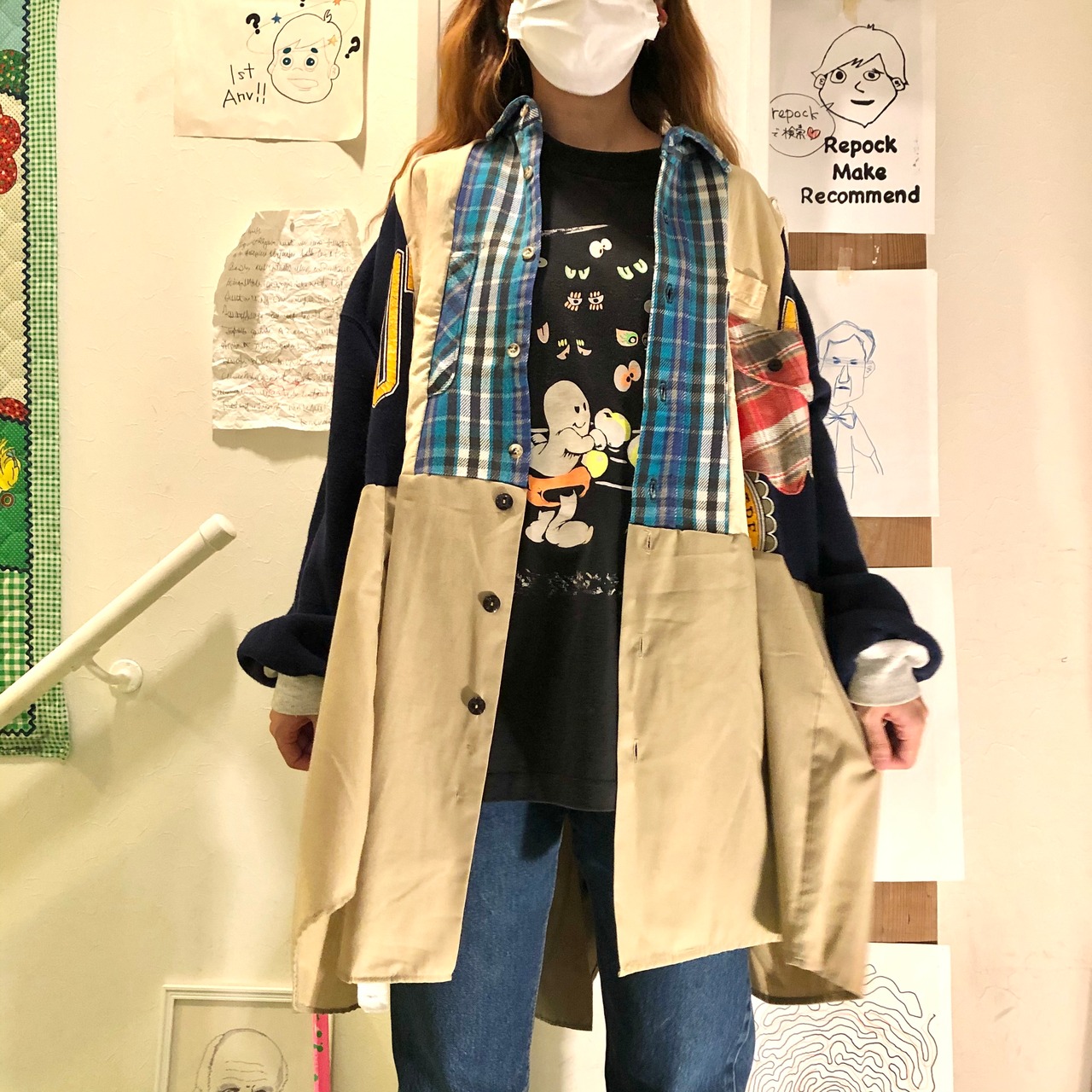 ネルシャツ、スウェット、コットンシャツをMIXしてリメイクした、Aラインシルエットなリメイクシャツ♡