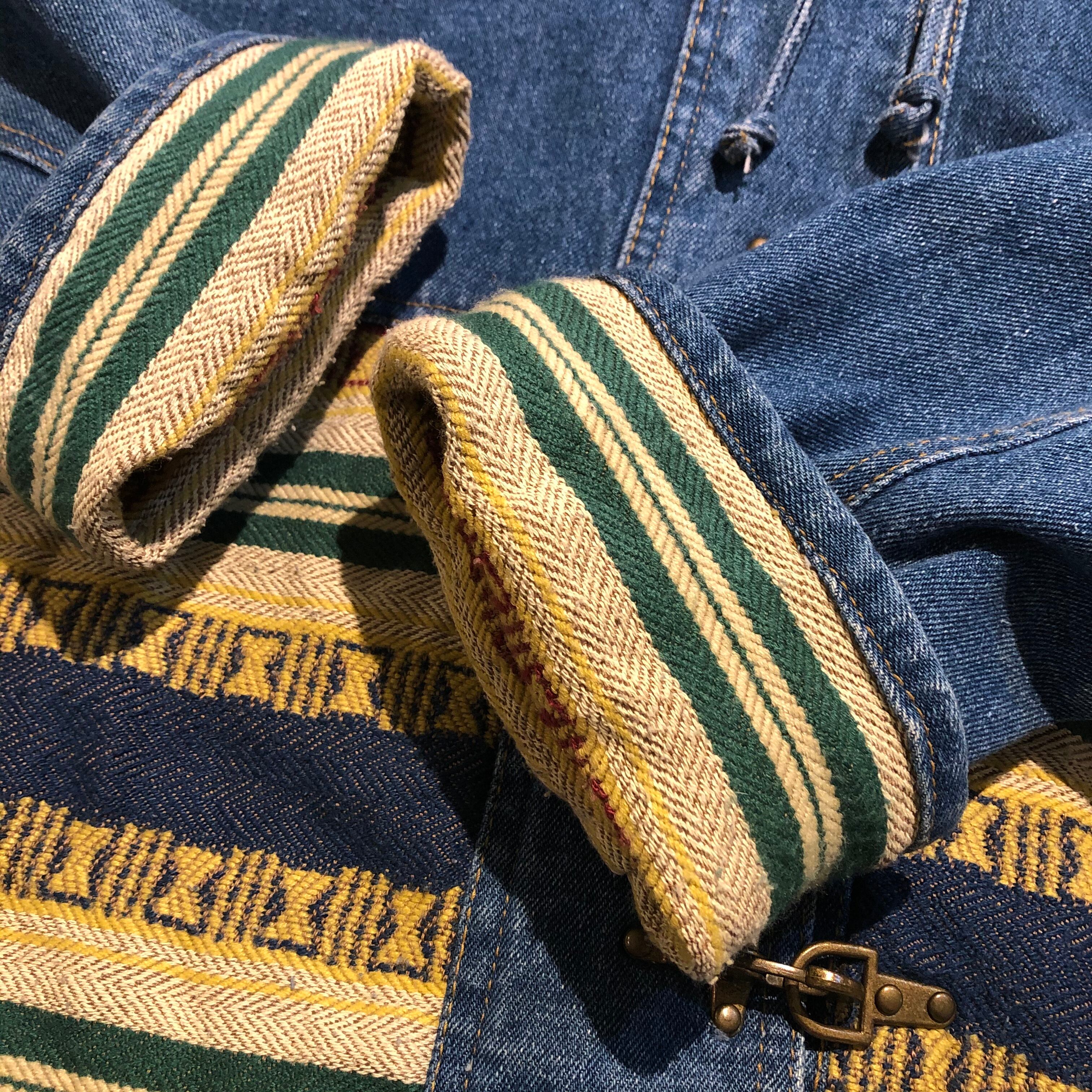 フロント中央の切り替え、袖裏にはオリエンタルなラグファブリック。のっぺりしたデニムに良いアクセント。