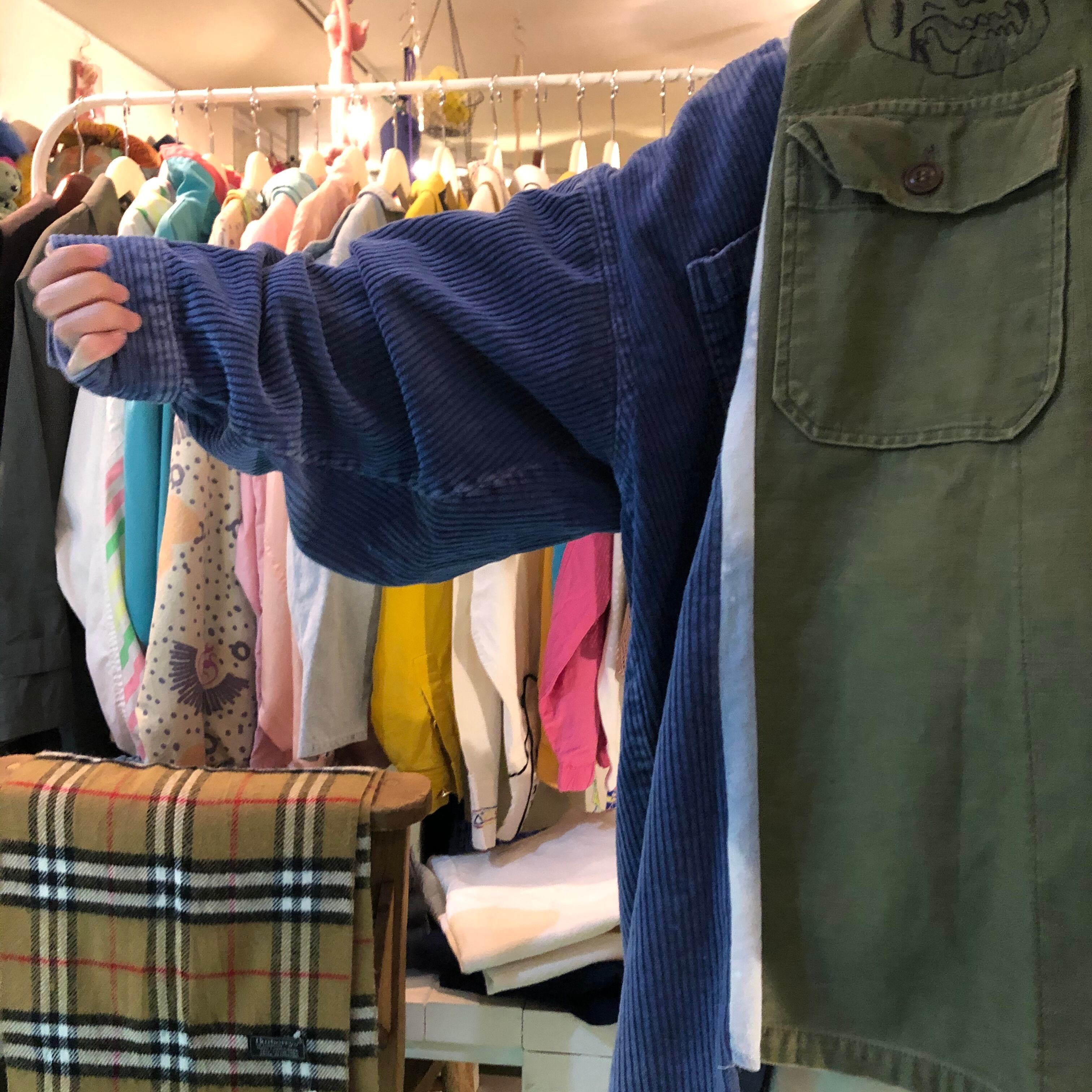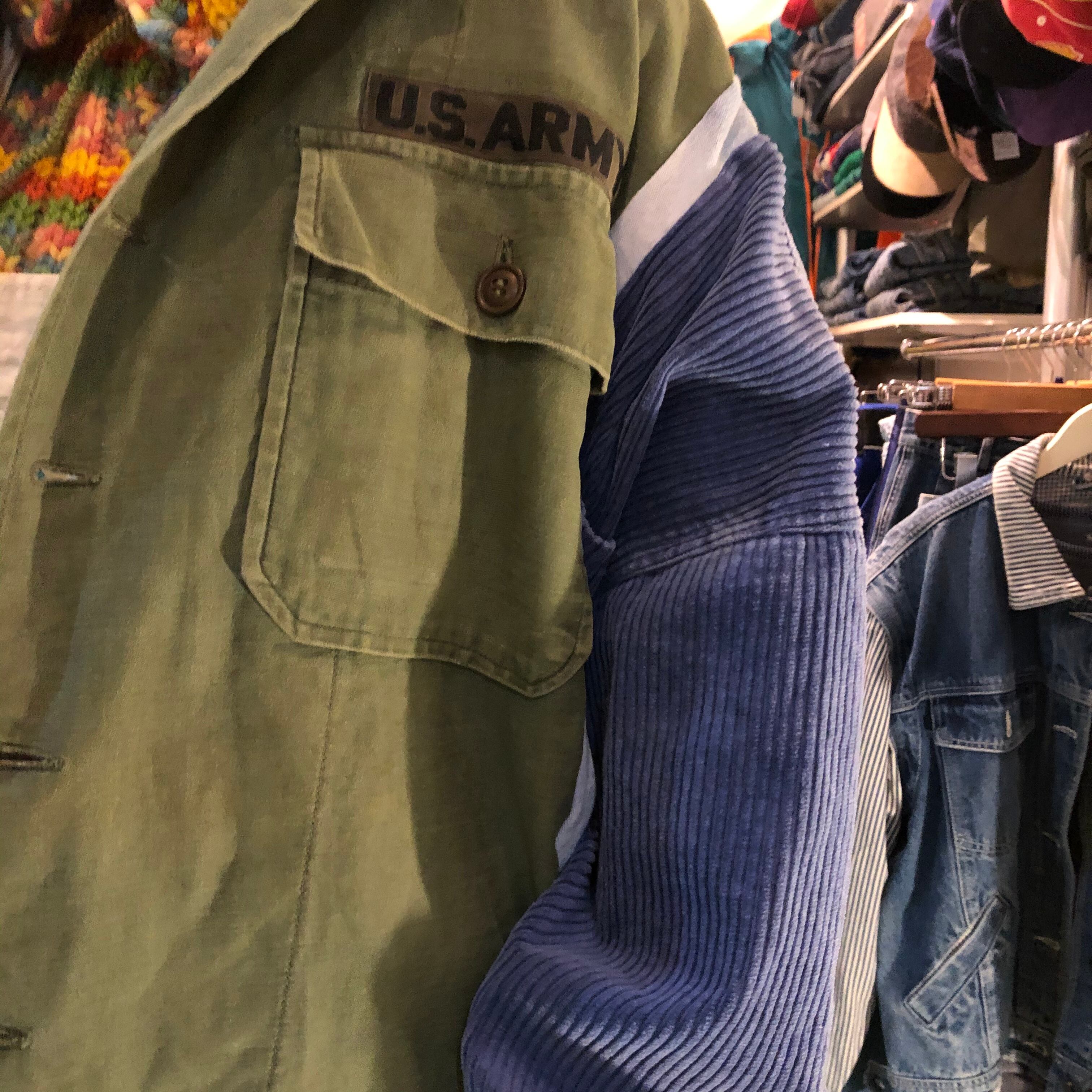 Oldなユーティリティシャツにライトオンスなデニム、ナイスカラーなコーデュロイシャツをドッキングした、リメイクシャツジャケット♡