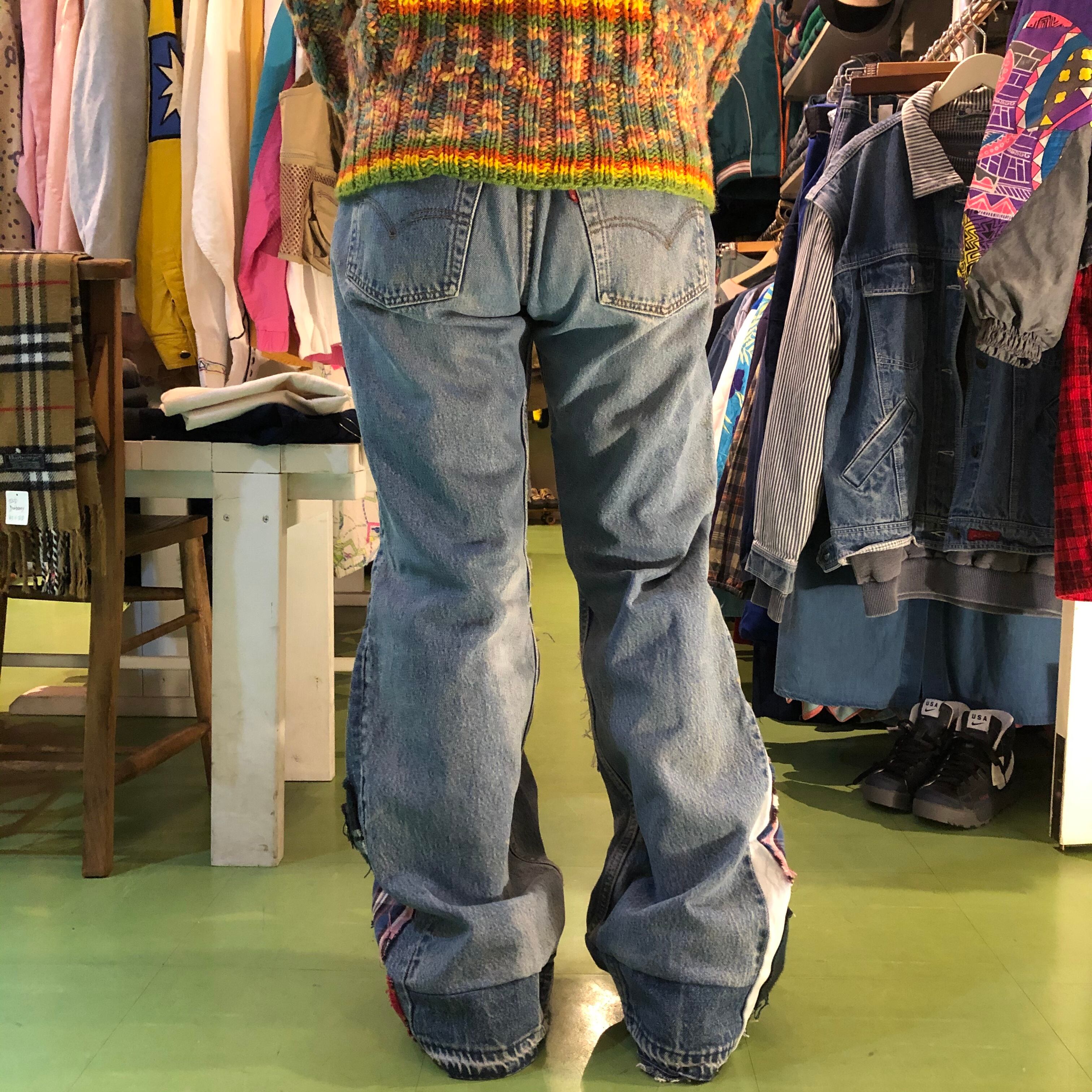 Levis501をベースに、別デニムを貼り付け、サイドにデニムを足してフレアシルエットに♡
