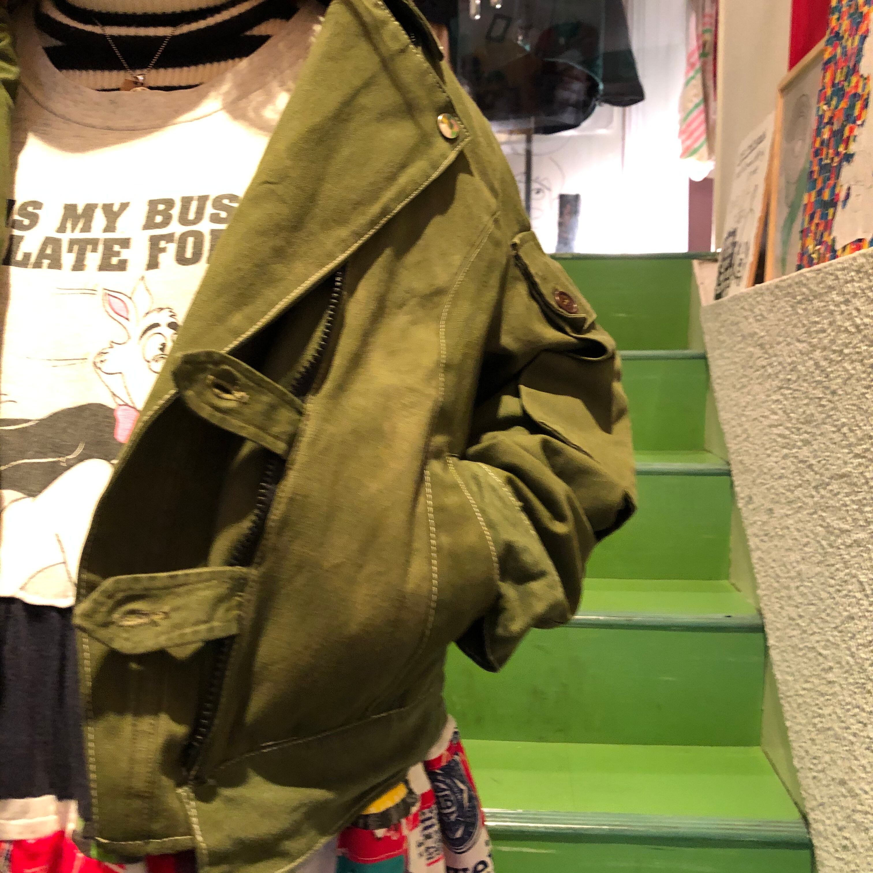 オランダ軍のカーゴパンツを数本解体、スウェーデン軍のモーターサイクルジャケットのディテールデザインを落とし込み再構築したライダースジャケット♡