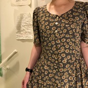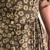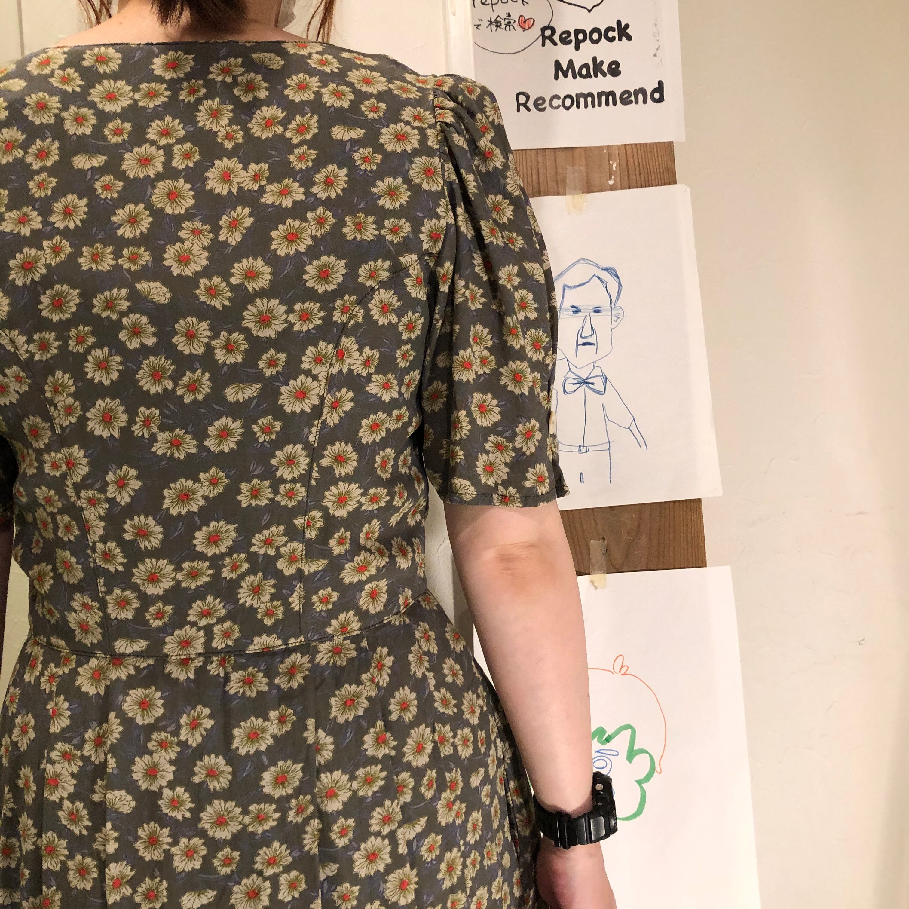 ネックの開き具合、程よいパフスリーブ、マーメイドなパターンからのVの字ウエストライン、ウエストタックで程よいボリューム感とドレープ感のあるスカート部分などなど、全体的にどのディテールも抜群なバランス感。