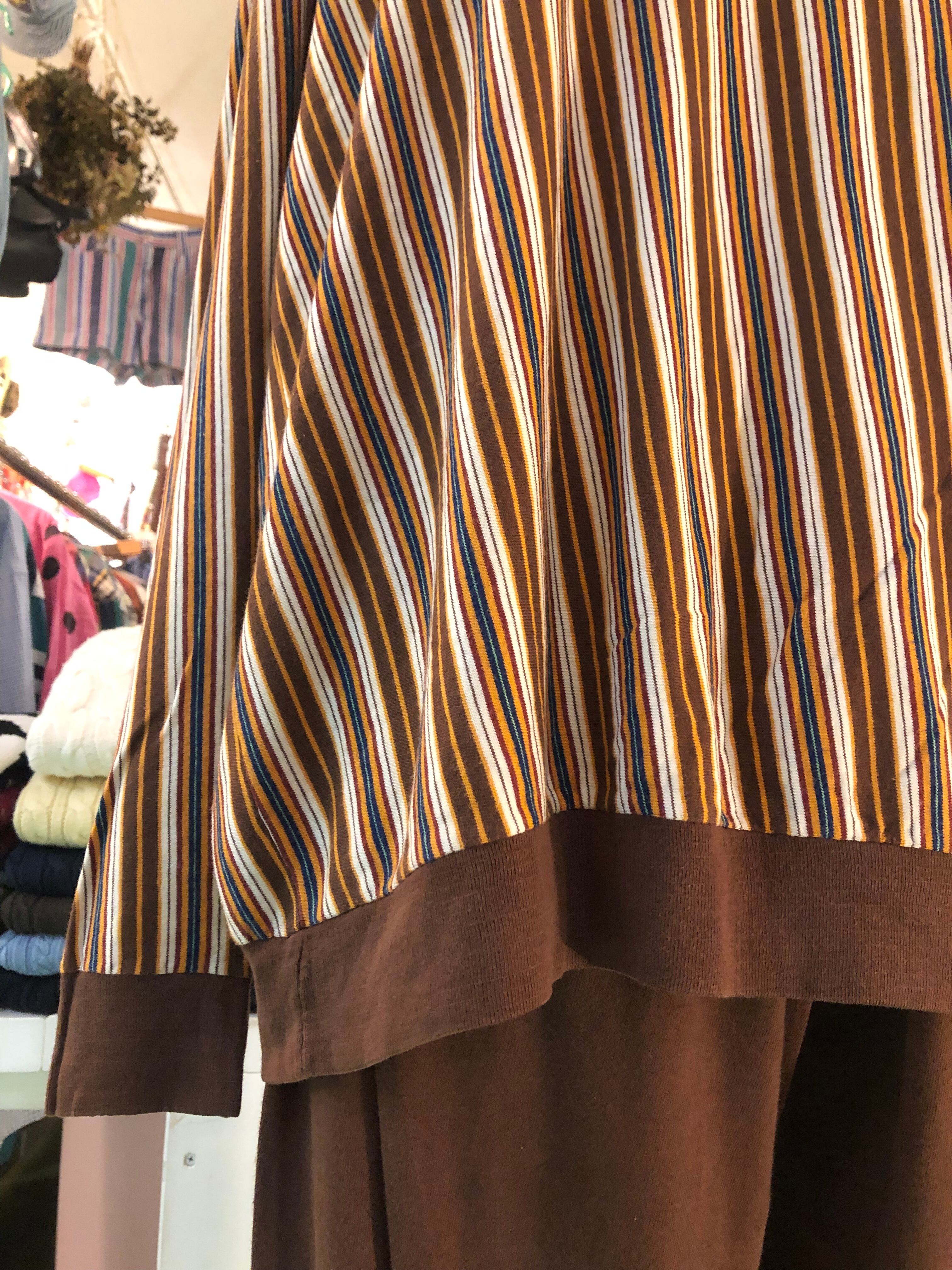 トップスはモックネック、ブラウスベースに独特な配色のストライプ、袖リブ&裾リブ。