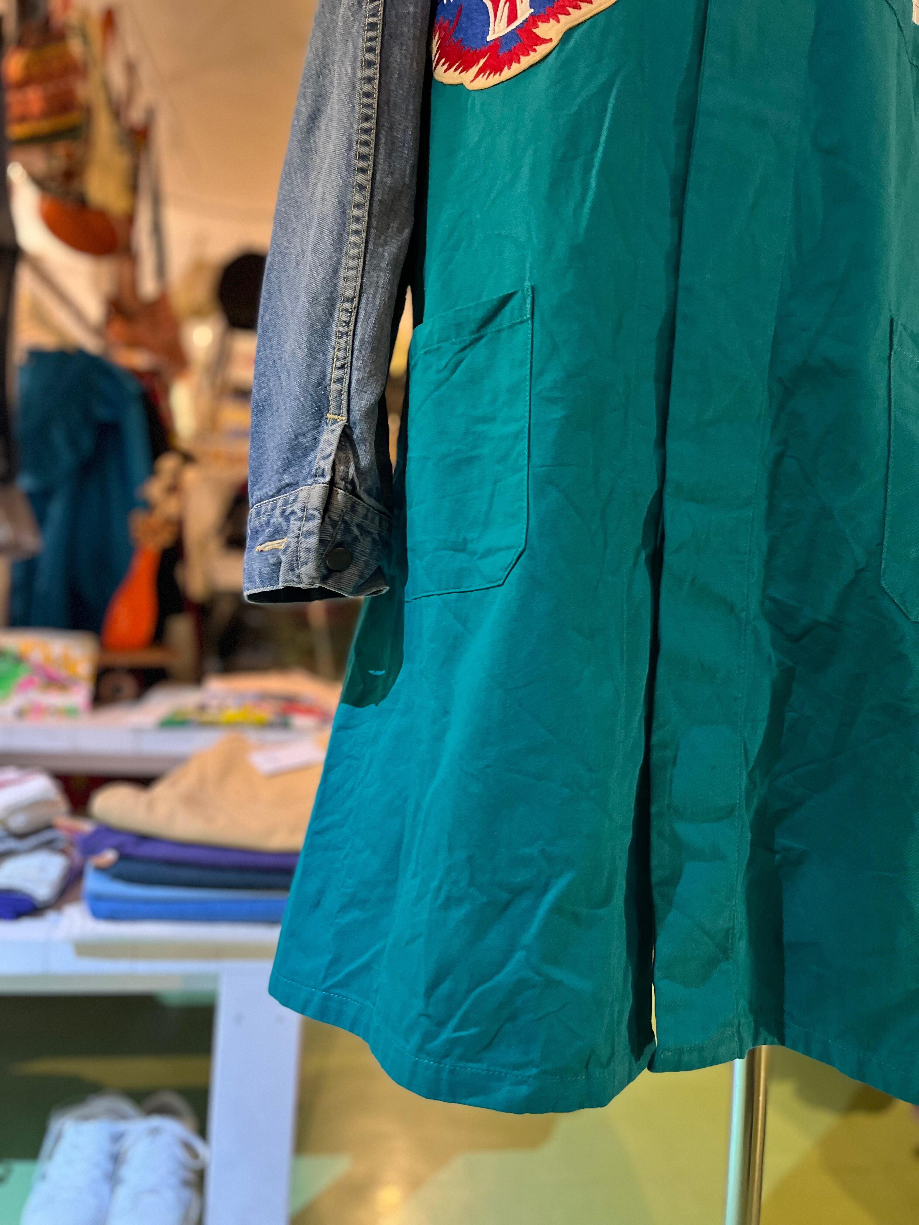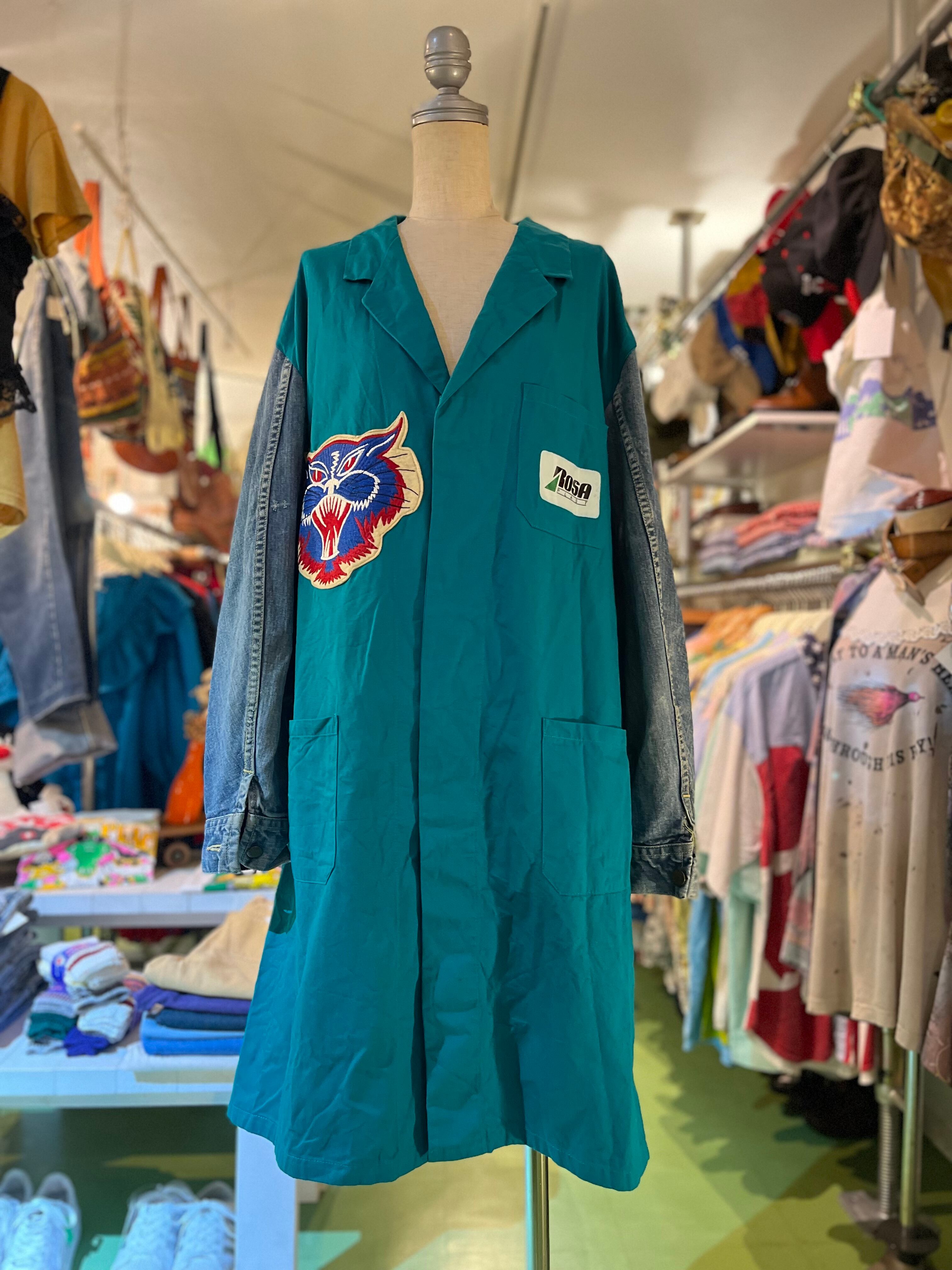 Euro ワークコートに、60s- Leeのデニムジャケットの袖をドッキング、バックにTシャツのグラフィック切り抜き、フロントにワッペンを貼り付けた、シンプルなリメイクワークコート♡