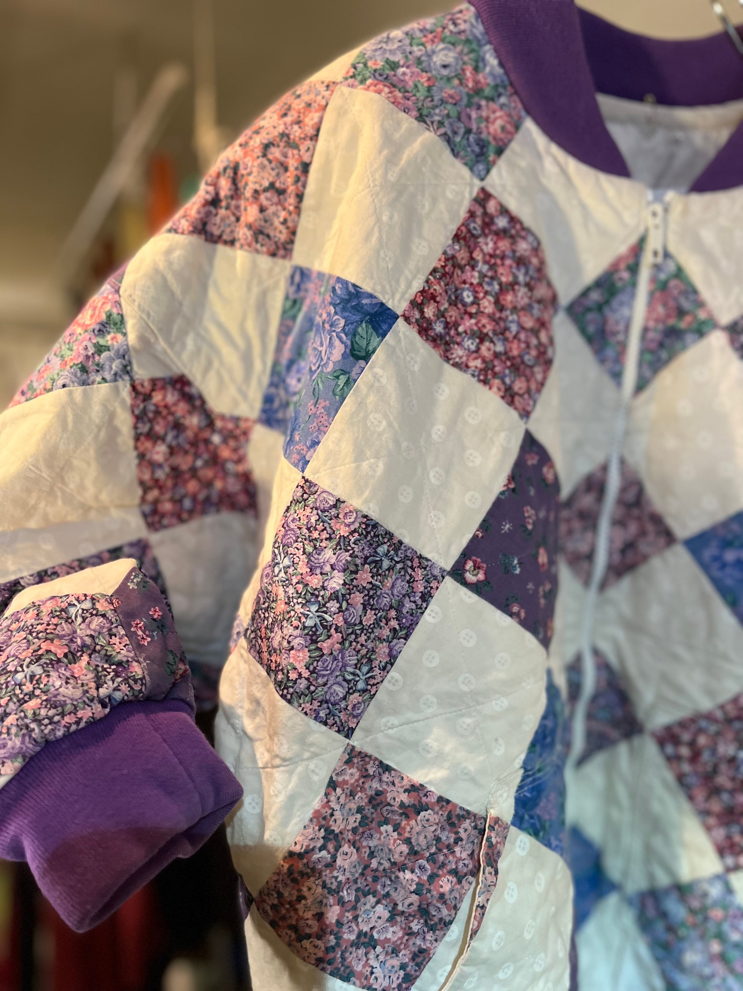 ホワイトベースにパープルなネックに袖リブと裾リブ、花柄のファブリックのパッチワーク。
