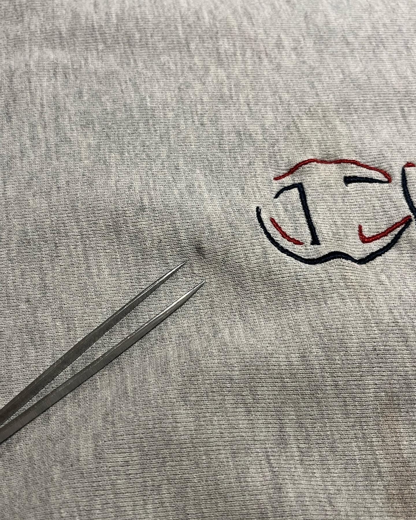 ネック、袖口、裾はライン入りのリブ編み、フロントにロゴ刺繍。